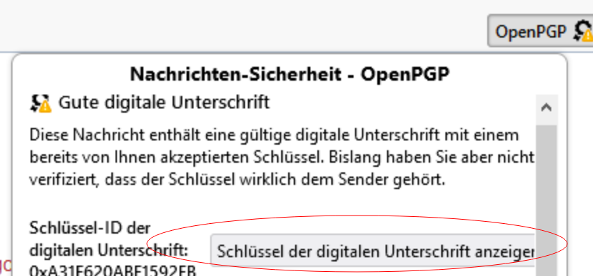 Dazu wählen wir nochmal die Mail der Person aus und sehen nun eine Warnung beim OpenPGP Signet:
